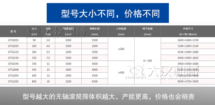 該設(shè)備型號有多種,每種型號的設(shè)備機(jī)重、體積、效率、產(chǎn)能、電機(jī)功率等各不一樣,型號越大的無軸滾筒篩體積越大、產(chǎn)能更高,價格也會稍貴些,不過給客戶帶來的經(jīng)濟(jì)利潤將會更顯著;反之,型號小的無軸滾筒篩價格低,適合于小規(guī)模企業(yè),效益較大型號設(shè)備低些。