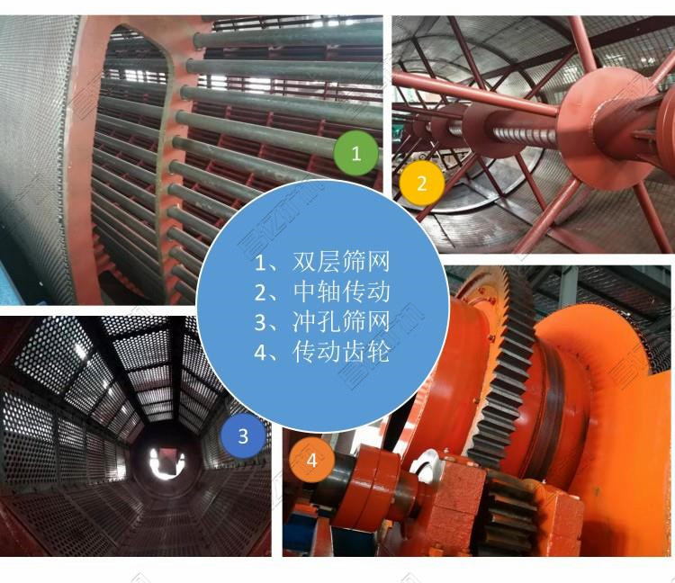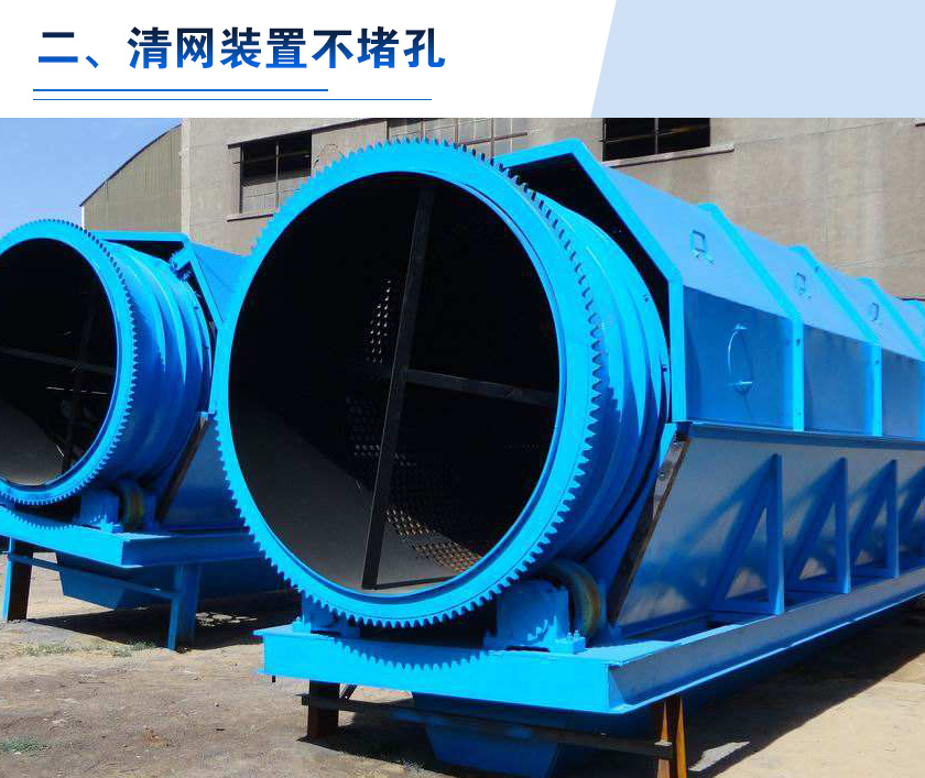 無軸滾筒篩內(nèi)置清網(wǎng)裝置,到需要分選的生活垃圾倍送入篩分機滾筒中,通過不同翻滾來達到篩選的效果,二其清網(wǎng)裝置會不間斷地對篩同實施清理,使篩分筒在整個工作過程中始終保持清潔、不粘、不堵。