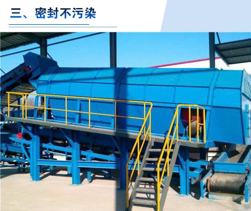 無軸滾筒篩篩筒安裝經(jīng)過機體密封,從而保證設(shè)備在工作中,有效避免生活垃圾外逸,從根本上減少了生活垃圾對環(huán)境的污染。