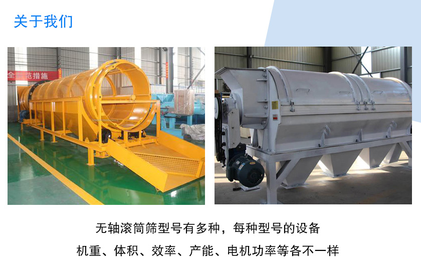 提示:無軸滾筒篩型號有多種,每種型號的設(shè)備機重、體積、效率、產(chǎn)能、電機功率等各不一樣,型號越大的無軸滾筒篩體積越大、產(chǎn)能更高,價格也會稍貴些,不過給客戶帶來的經(jīng)濟利潤將會更顯著;反之,型號小的無軸滾筒篩價格低,適合于小規(guī)模企業(yè),效益較大型號設(shè)備低些。