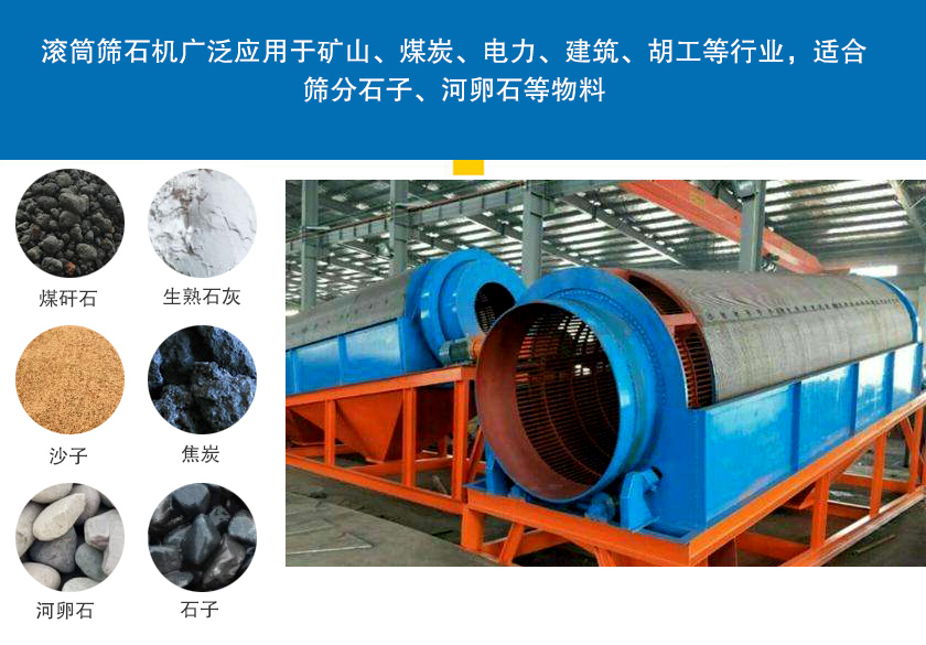 滾筒篩石機廣泛應(yīng)用于礦山、煤炭、電力、建筑、胡工等行業(yè),適合篩分石子、河卵石等物料,也可用戶篩分煤矸石、生熟石灰、沙子、焦炭等潮濕性易堵塞的物料。