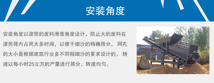 安裝角度以滾筒的廢料滑落角度設(shè)計,防止大的廢料在滾筒篩內(nèi)占用太多時間,以便于細沙的篩分, 網(wǎng)孔的大小是根據(jù)建筑行業(yè)多不同粗細沙的要求設(shè)計的, 轉(zhuǎn)速以每小時25立方的產(chǎn)量進行篩分,轉(zhuǎn)速均勻。