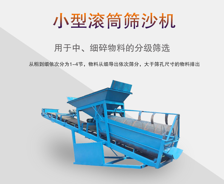 小型滾筒篩沙機主要用于中、細碎物料的分級篩選,按照不同的分級要求,從粗到細依次分為1-4節,物料從細導出依次篩分,大于篩孔尺寸的物料排出,篩面呈傾斜安裝,外部被密封隔離罩所隔離,可避免物料轉載篩分過程中出現的粉塵飛揚。