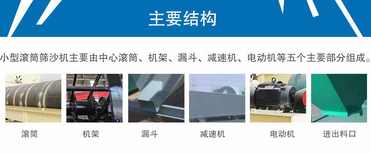 小型滾筒篩沙機主要由中心滾筒、機架、漏斗、減速機、電動機等五個主要部分組成。