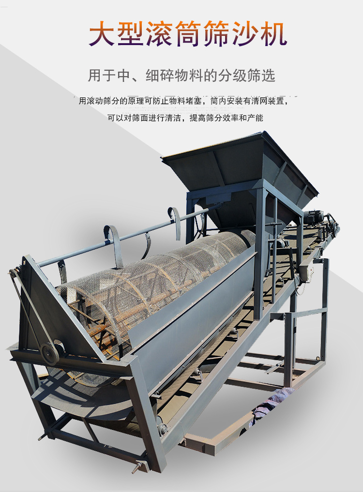 大型滾筒篩沙機采用滾動篩分原理(類似于攪拌機的攪拌原理),由鏟車上料,物料進入到滾筒后,由于滾筒的傾斜與滾動,使篩面上的物料不同的翻轉,成品料會漏出來,經過皮帶機傳送出料來,廢料從滾筒尾部漏出。